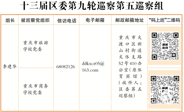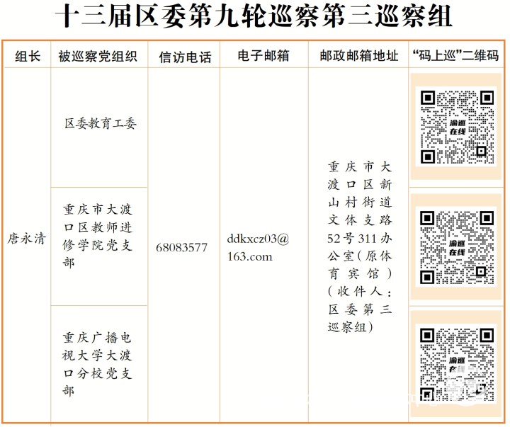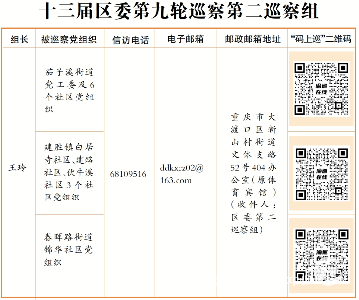 巡察期間,巡察組設(shè)有專門的聯(lián)系電話、電子郵箱、郵政信箱和巡察二維碼,歡迎廣大黨員、干部、群眾向巡察組反映問題、提供線索。信訪受理截止時(shí)間為2025年11月14日,舉報(bào)電話接聽時(shí)間為工作日9時(shí)至18時(shí)。巡察組主要受理反映被巡察黨組織領(lǐng)導(dǎo)班子及其成員、其他區(qū)管干部、內(nèi)設(shè)部門負(fù)責(zé)人、下一級單位班子成員及其他重要崗位干部問題的來信、來電、來訪,重點(diǎn)是關(guān)于違反政治紀(jì)律、組織紀(jì)律、廉潔紀(jì)律、群眾紀(jì)律、工作紀(jì)律、生活紀(jì)律等方面的舉報(bào)和反映。其他不屬于巡察受理范圍的信訪問題,將按規(guī)定轉(zhuǎn)有關(guān)部門處理。